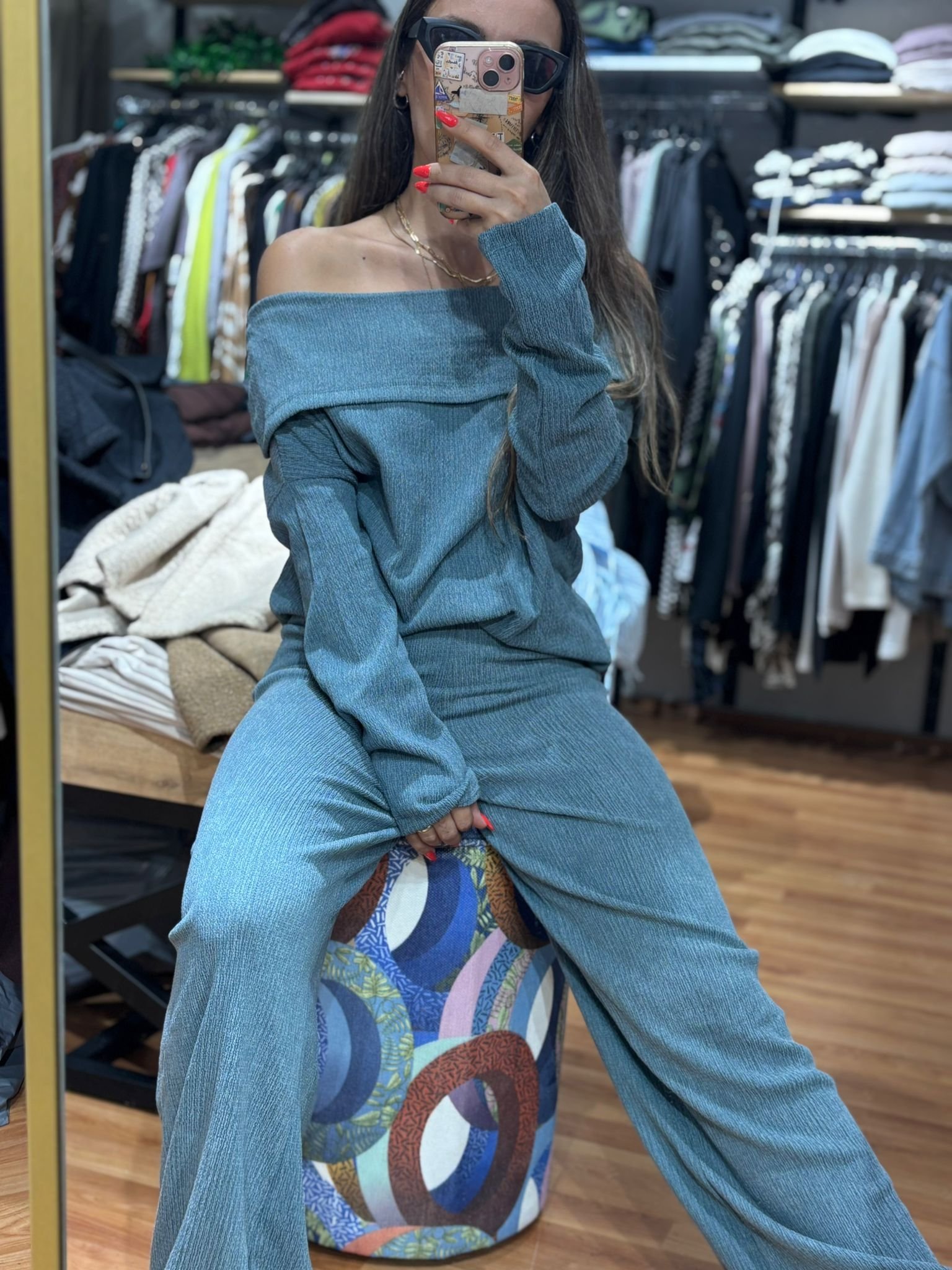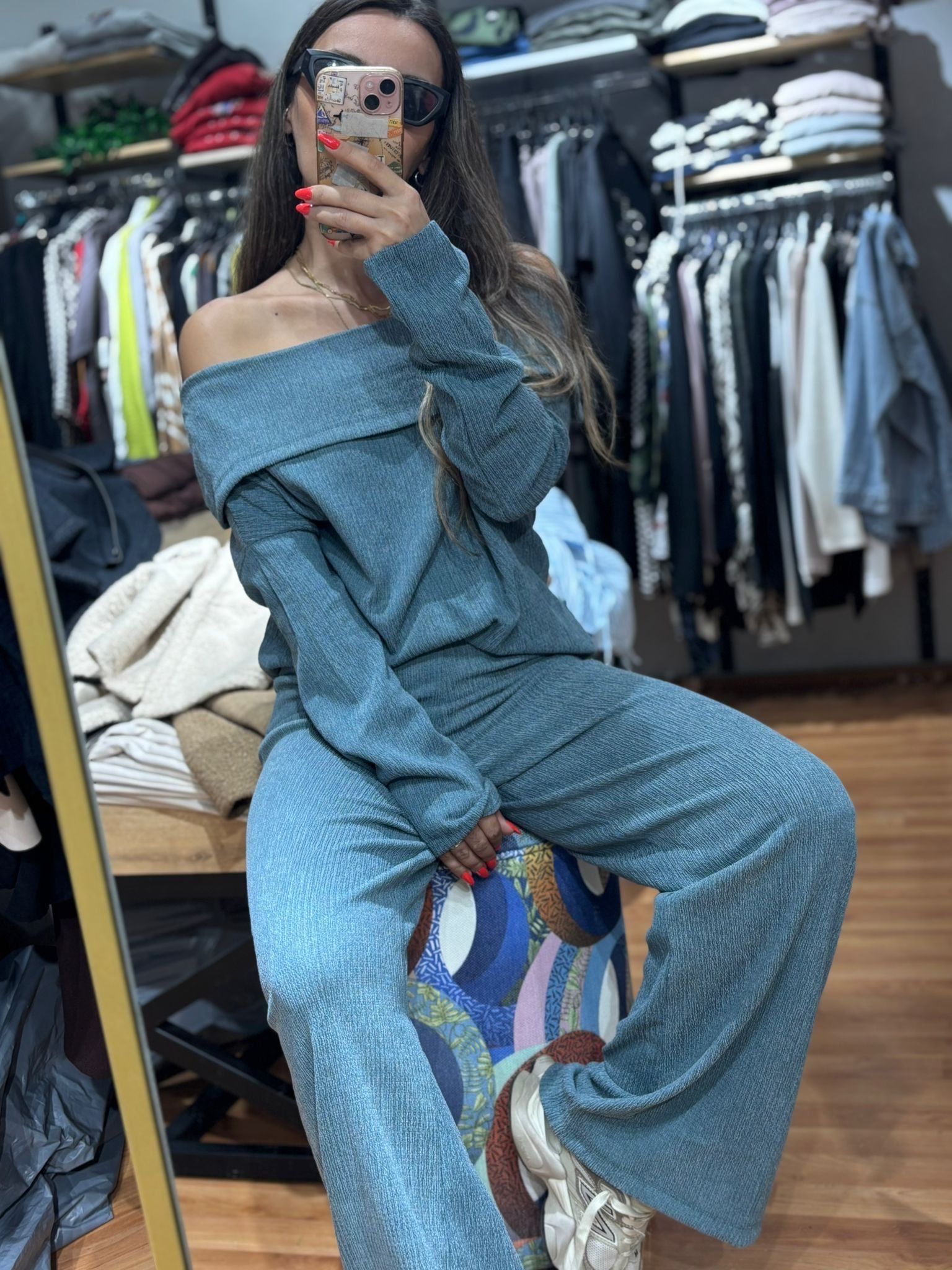•Crinkle kumaş dokusu • Düşük omuz / Madonna yaka • Rahat kalıp pantolon • Esnek ve dökümlü form